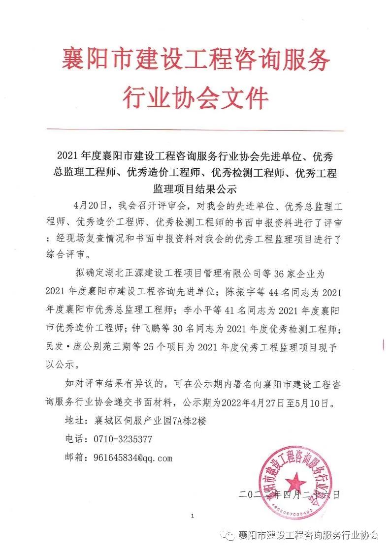 2021年度襄阳市建设工程咨询服务行业协会先进单位、优秀总监理工程师、优秀造价工程师、优秀检测工程师、优秀工程监理项目结果公示