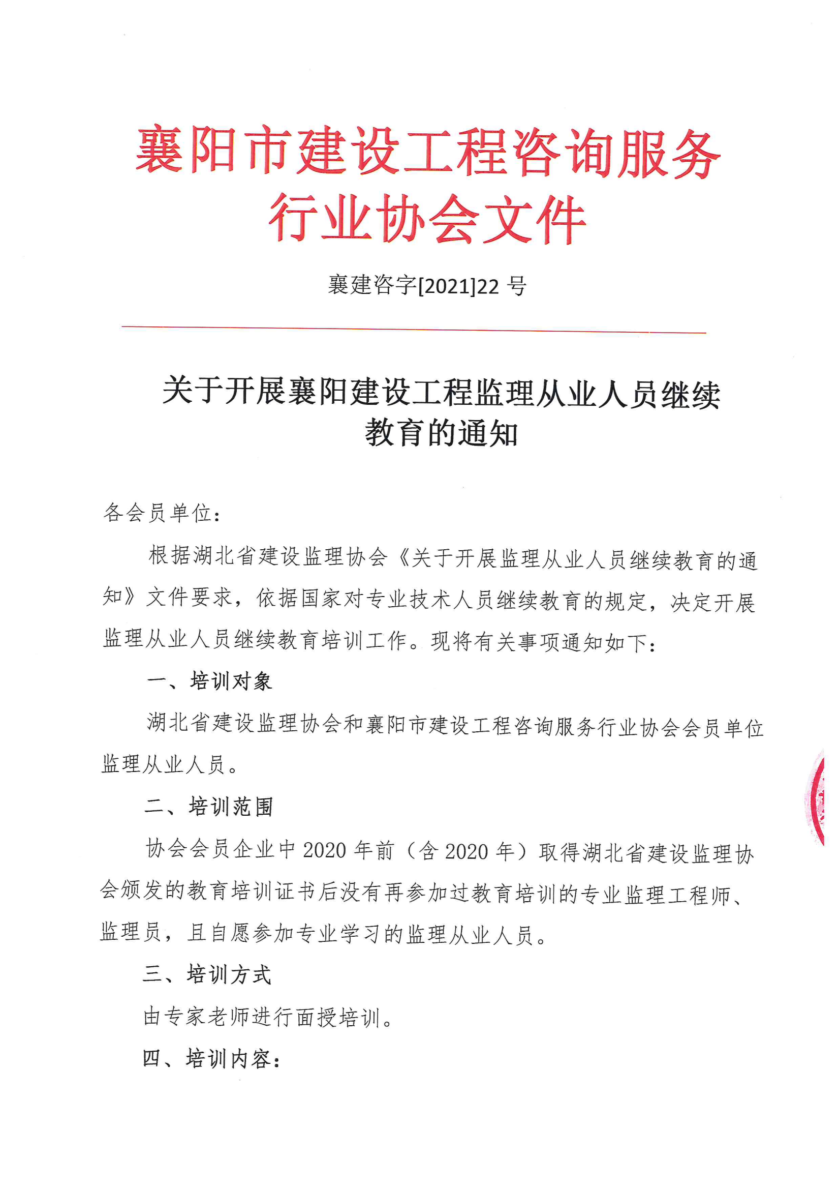 襄建咨字[2021]22号关于开展襄阳建设工程监理从业人员继续教育的通知