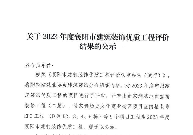 关于2023年度襄阳市建筑装饰优质工程评价结果的公示