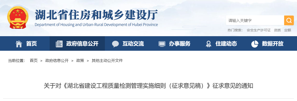 关于对《湖北省建设工程质量检测管理实施细则(征求意见稿)》征求意见的通知