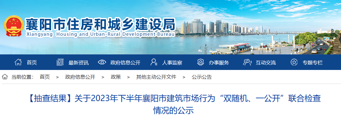 关于2023年下半年襄阳市建筑市场行为“双随机、一公开”联合检查情况的公示