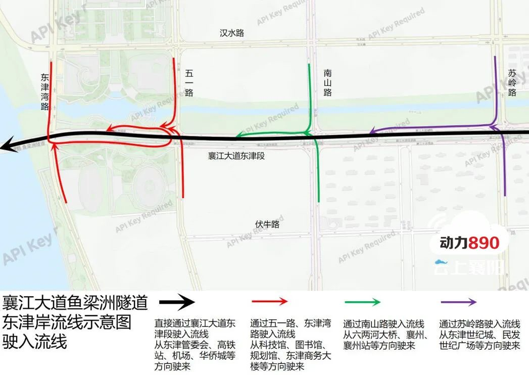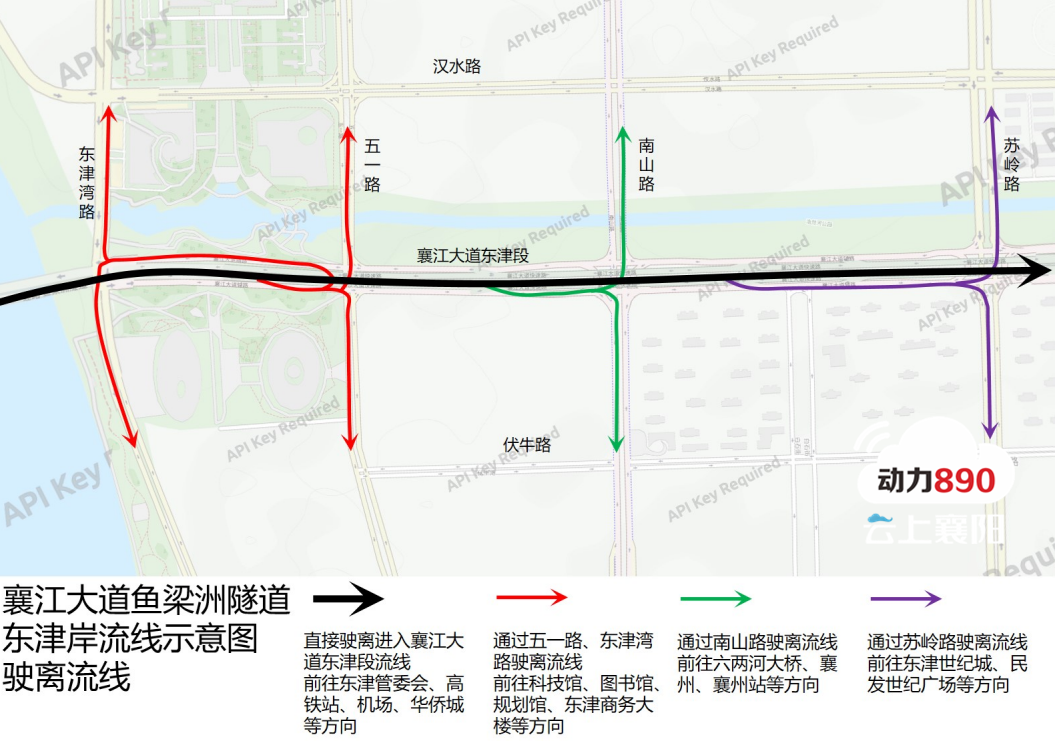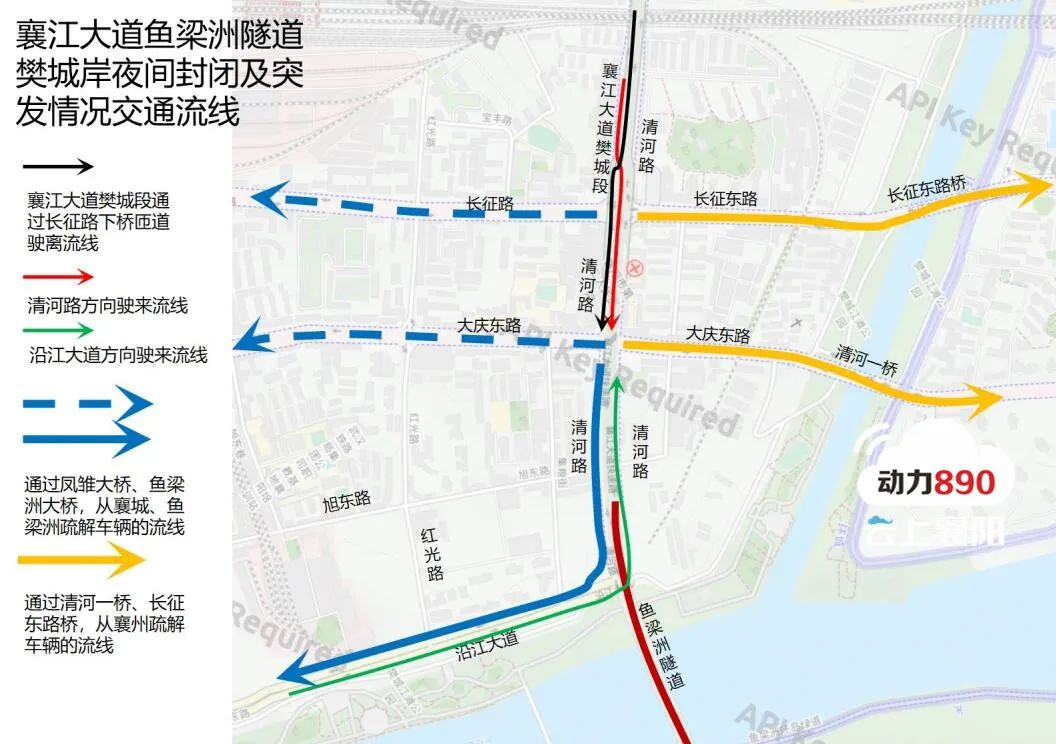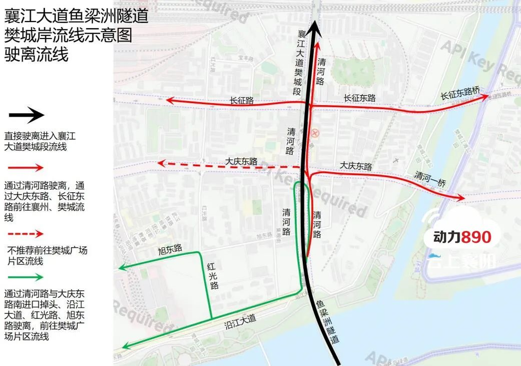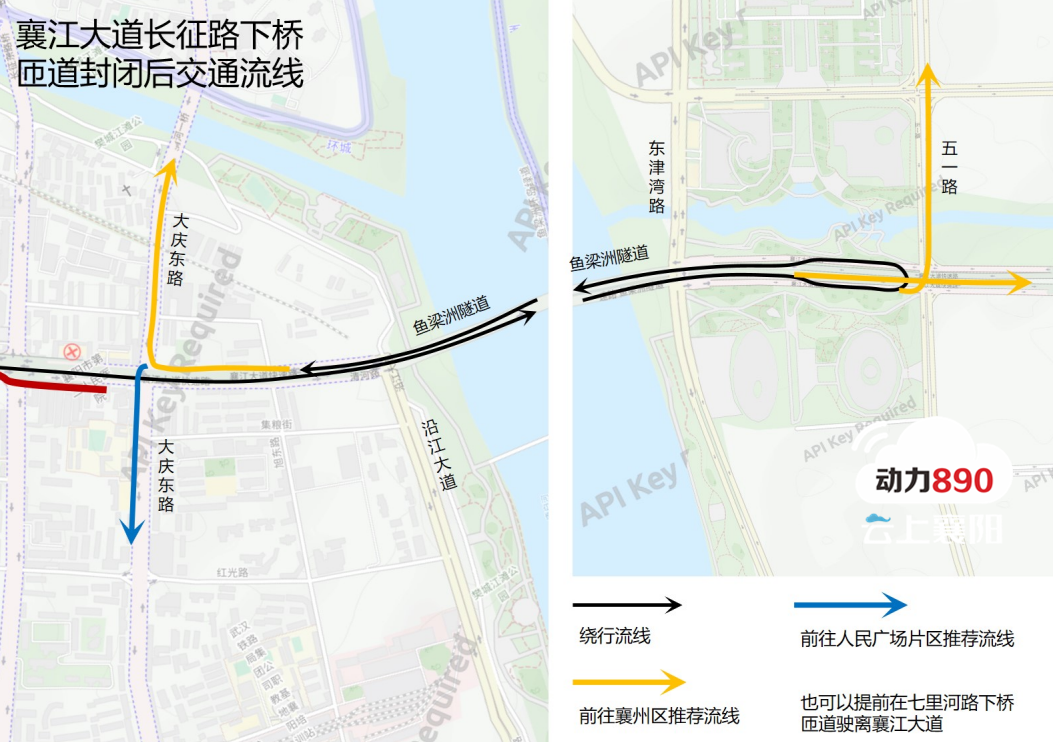 因襄江大道樊城段长征路下桥匝道位置距离大庆路与清河路交叉口过近,无足够蓄车区,经过研判隧道开通后该路口流量将激增,高峰时段易因车流量过大拥堵至高架主线。为了保障襄江大道的畅通运行,当发生匝道车辆排队溢出并影响主线通行时,拟将长征路下桥匝道封闭,需下匝道通行车辆建议直行进入鱼梁洲隧道在东津五一路路口掉头,通过鱼梁洲隧道完成绕行,预计绕行时间12分钟。
