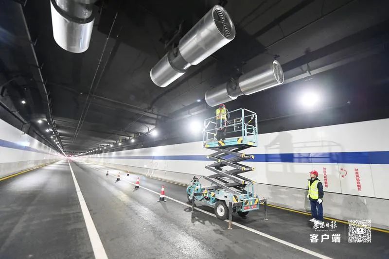 鱼梁洲隧道封闭后,几十名作业人员进入隧道开始忙起来,洒水车、洗扫车对沥青路面进行清洁,清洁人员清理排水边沟、擦拭装饰板和电光标识,巡检人员对隧道设施进行检修和功能测试。