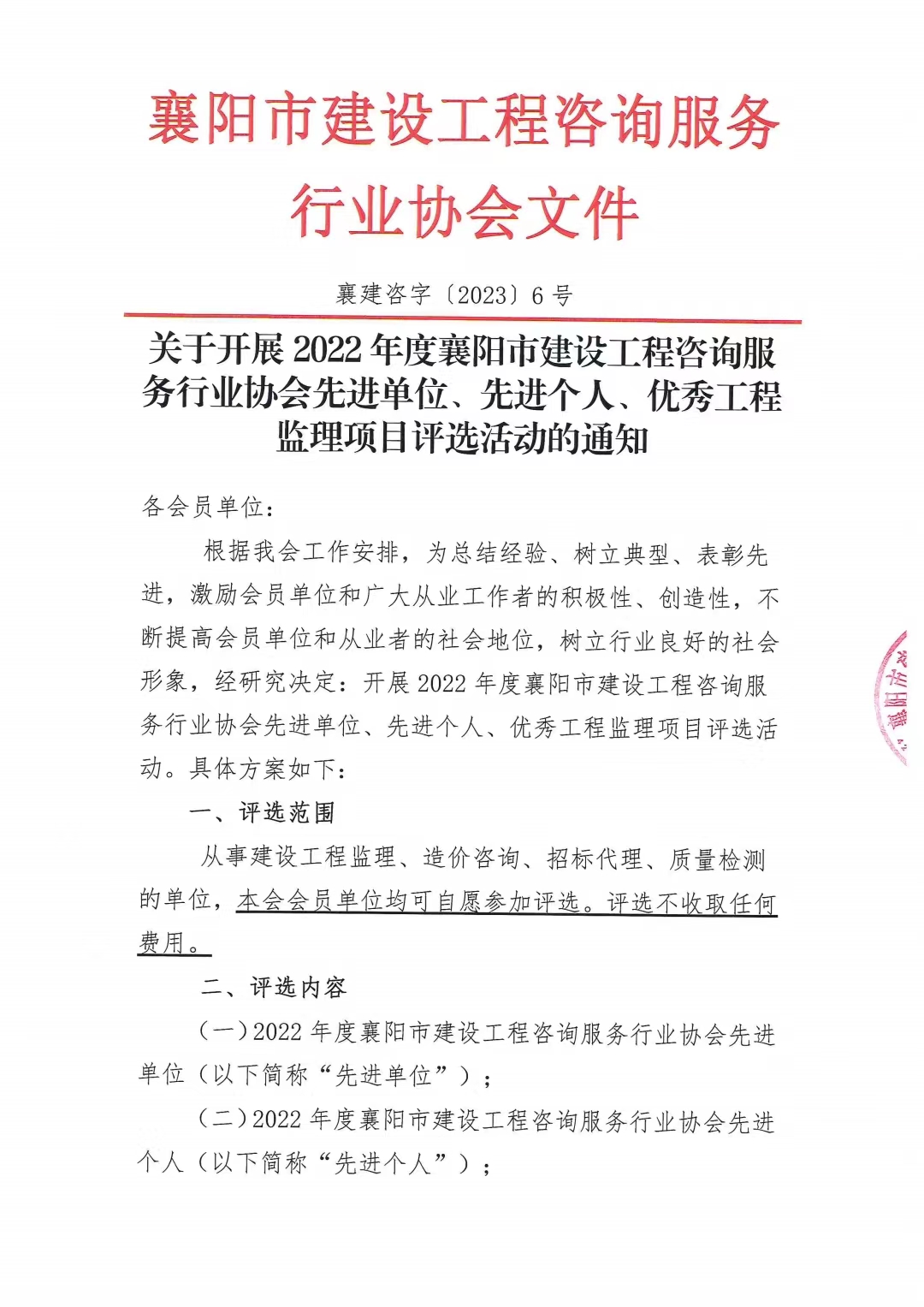 关于开展2022年度襄阳市建设工程咨询服务行业协会先进单位、先进个人、优秀工程监理项目评选活动的通知