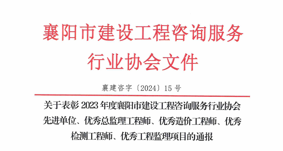 关于表彰2023年度襄阳市建设工程咨询服务行业协会 先进单位、优秀总监理工程师、优秀造价工程师、优秀 检测工程师、优秀工程监理项目的通报