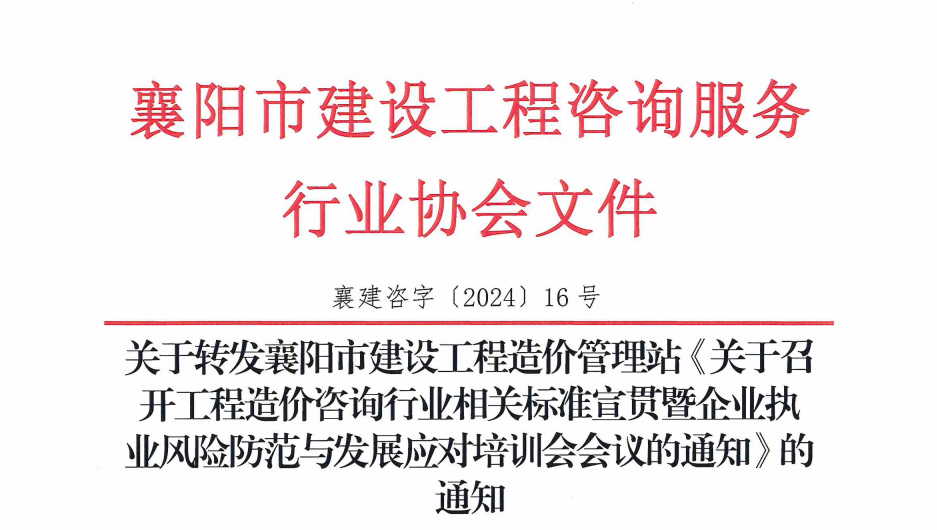 关于转发襄阳市建设工程造价管理站《关于召开工程造价咨询行业相关标准宣贯暨企业执业风险防范与发展应对培训会会议的通知》的通知