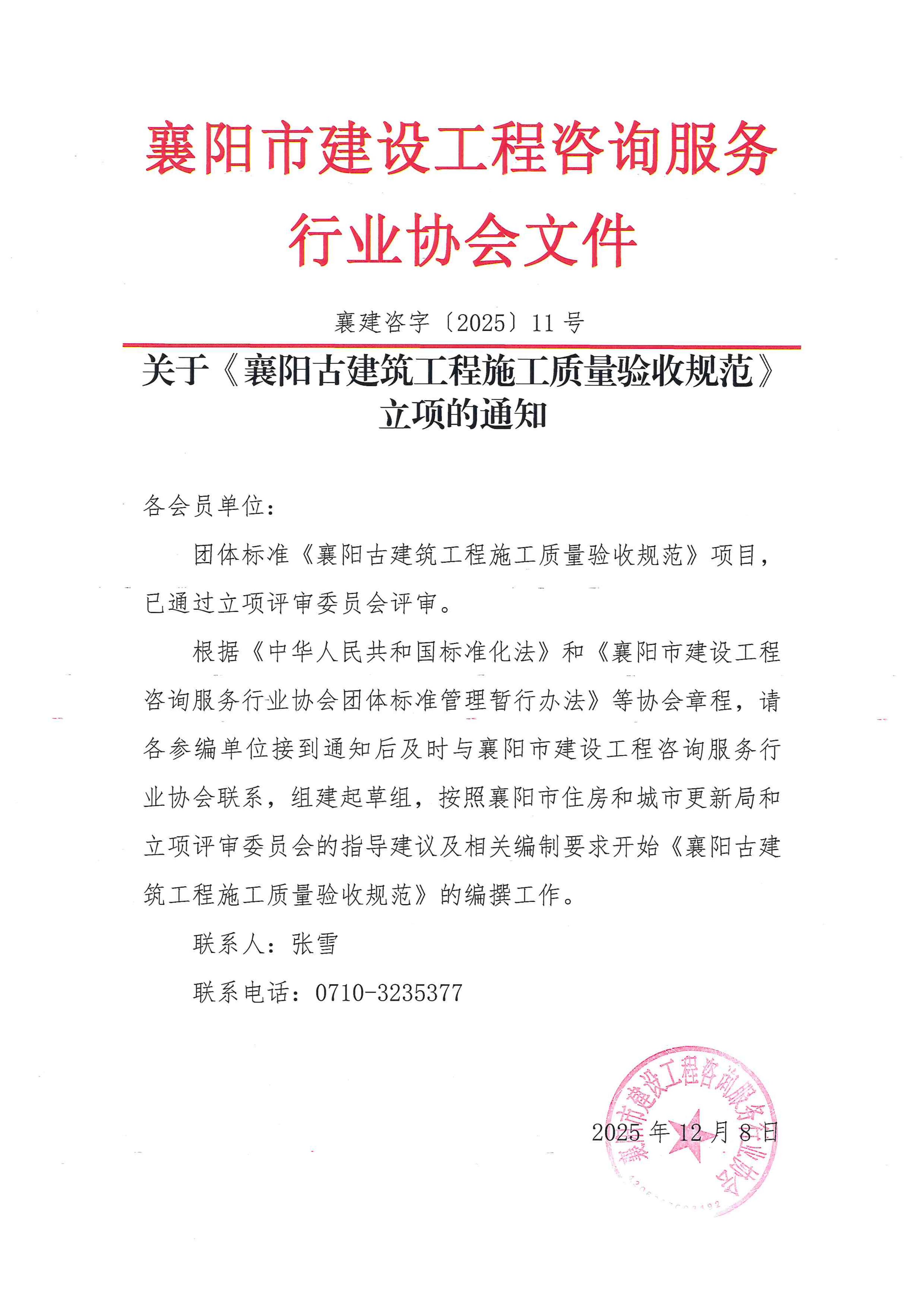 襄建咨字〔2025〕11号 关于《襄阳古建筑工程施工质量验收规范》立项的通知