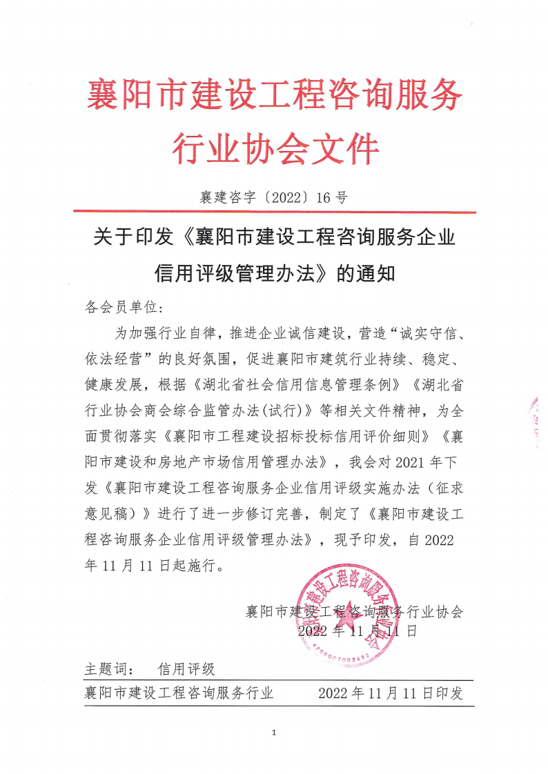 关于印发《襄阳市建设工程咨询服务企业 信用评级管理办法》的通知