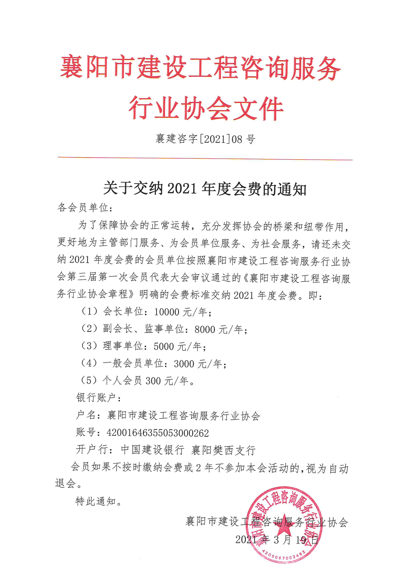 襄建咨字【2021】08号关于交纳2021年度会费的通知