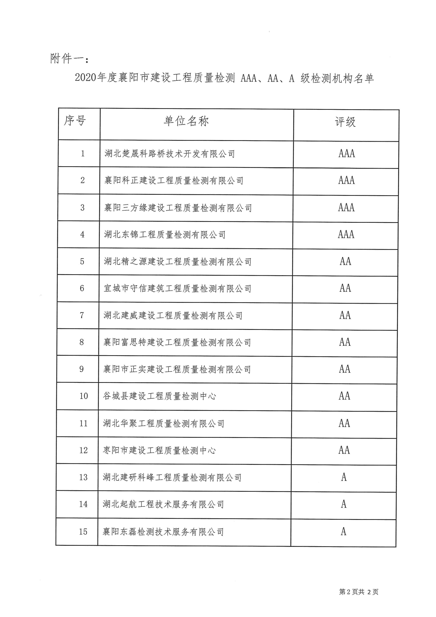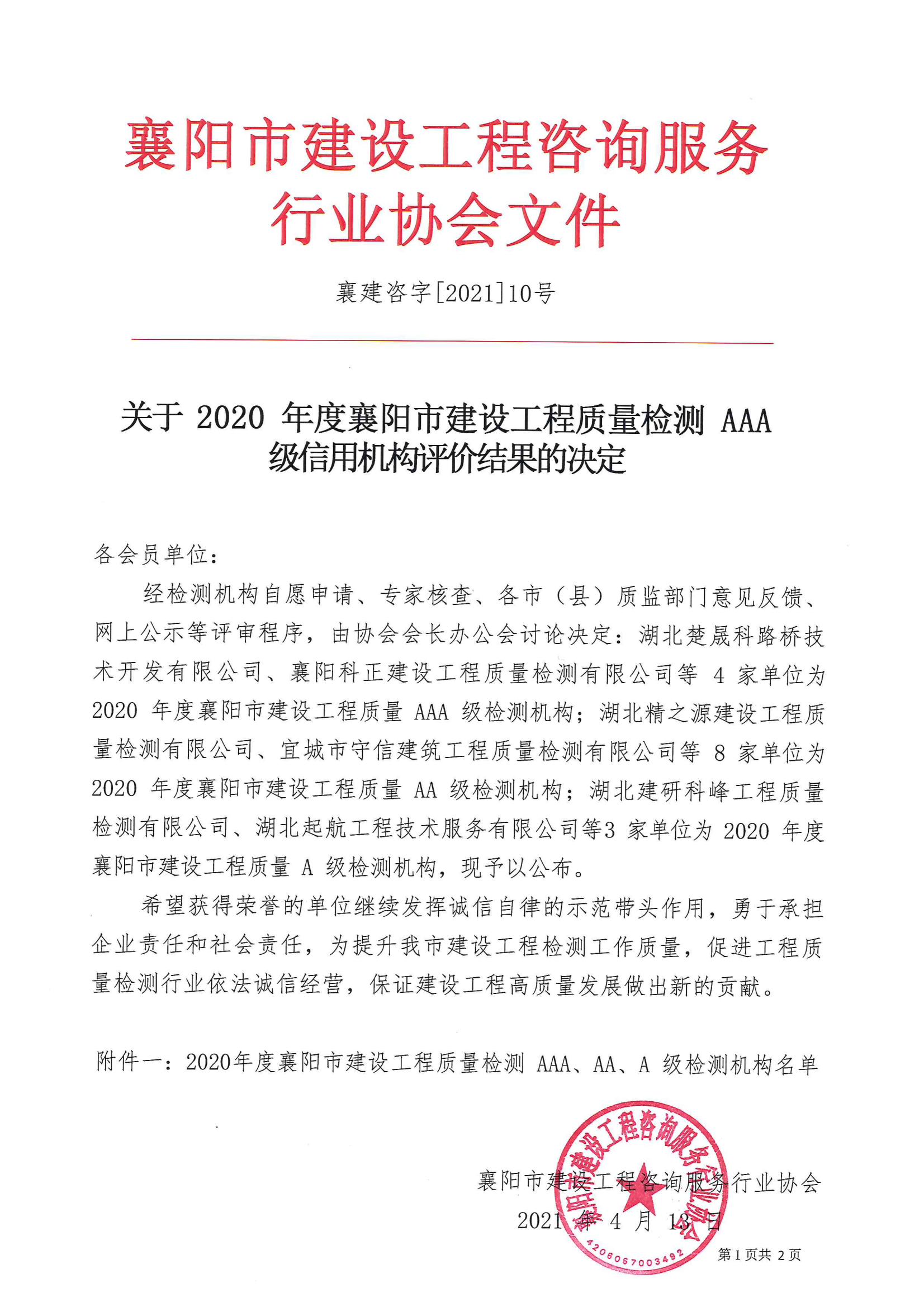 襄建咨字【2021】10号关于 2020年度襄阳市建设工程质量检测 AAA 级信用机构评价结果的决定