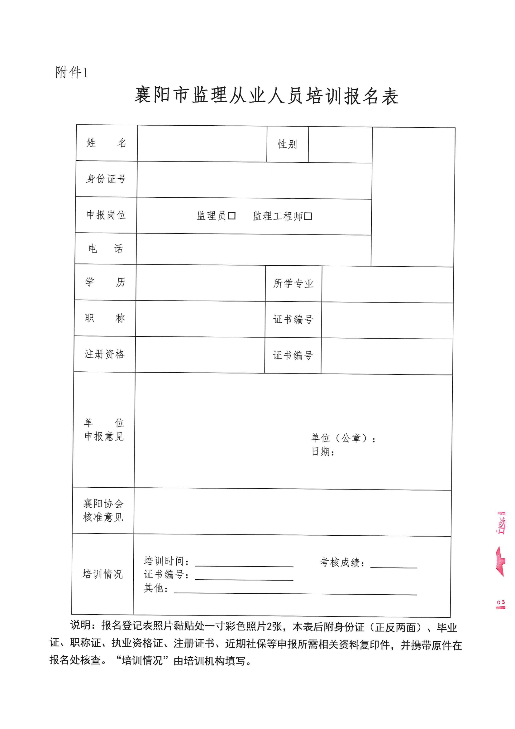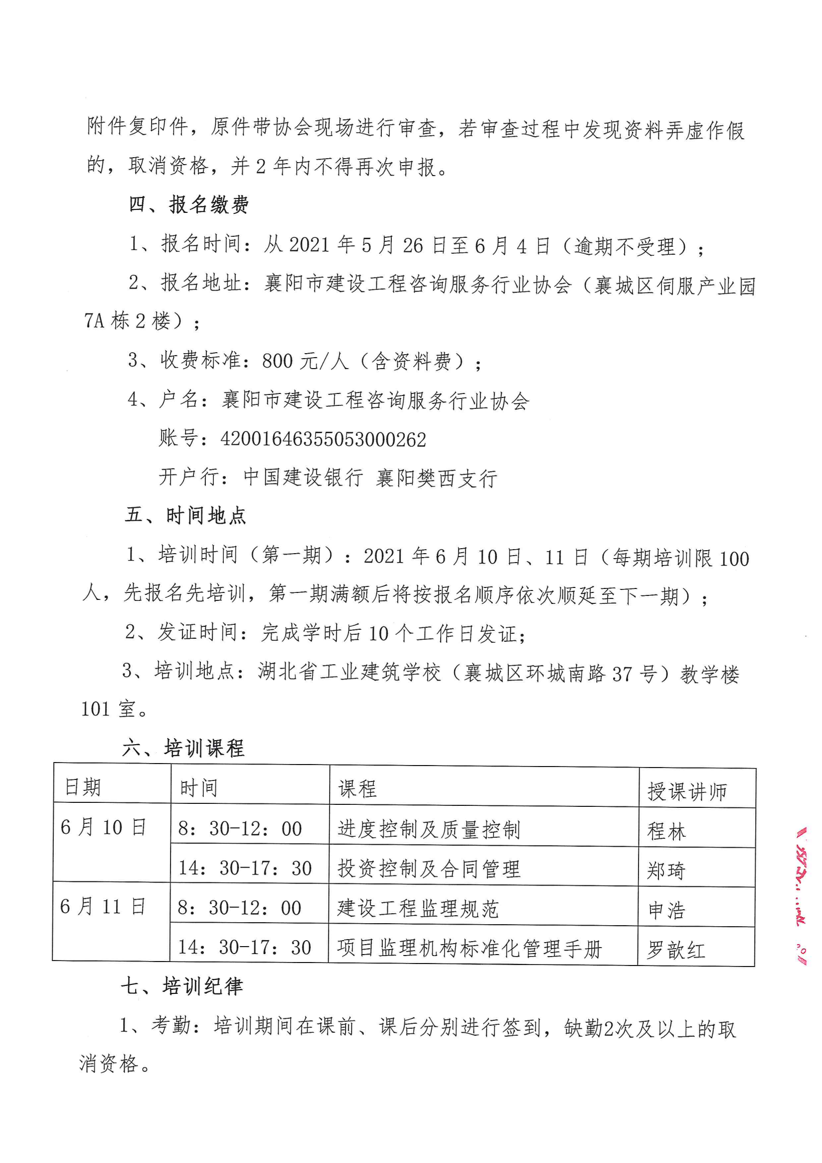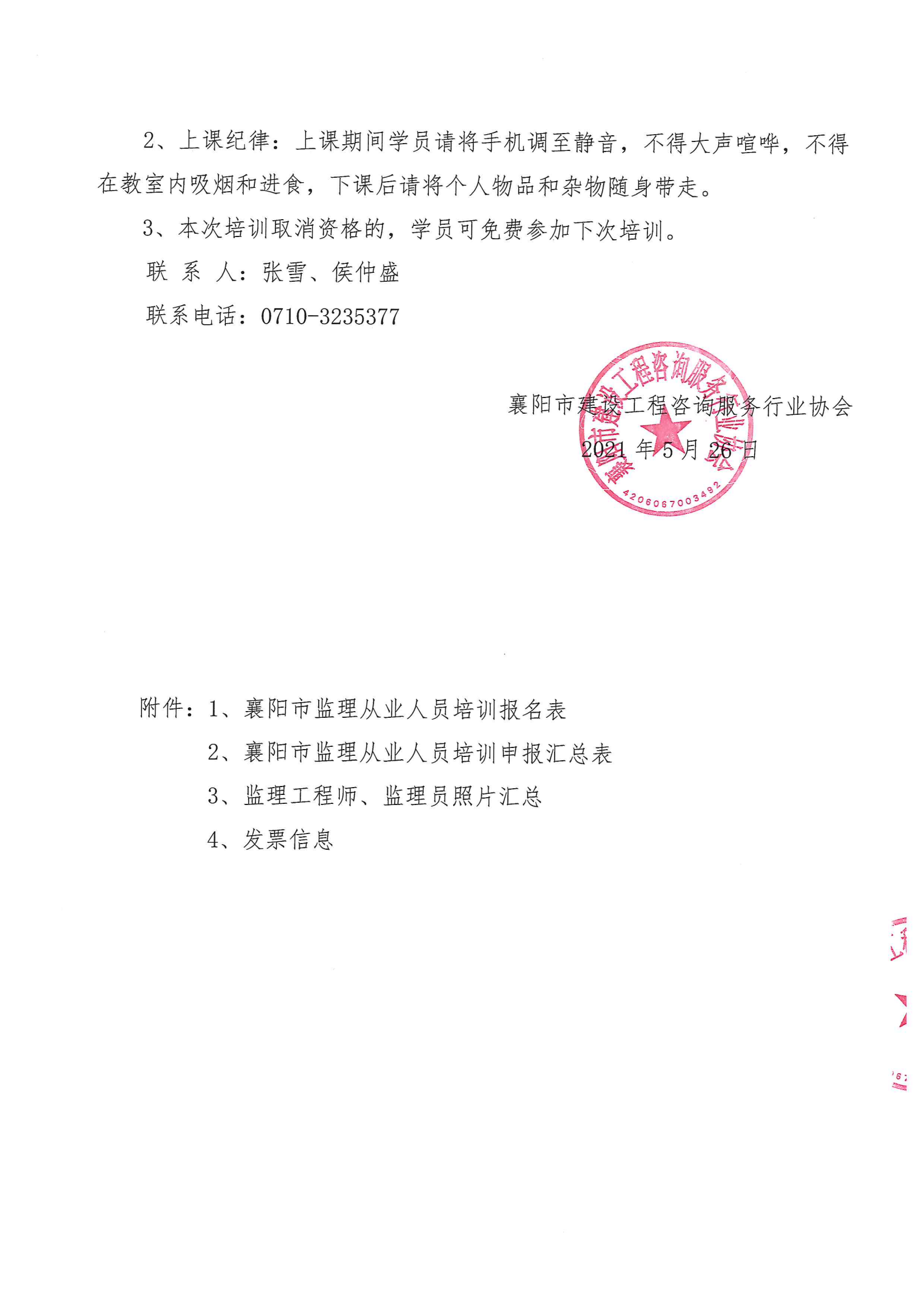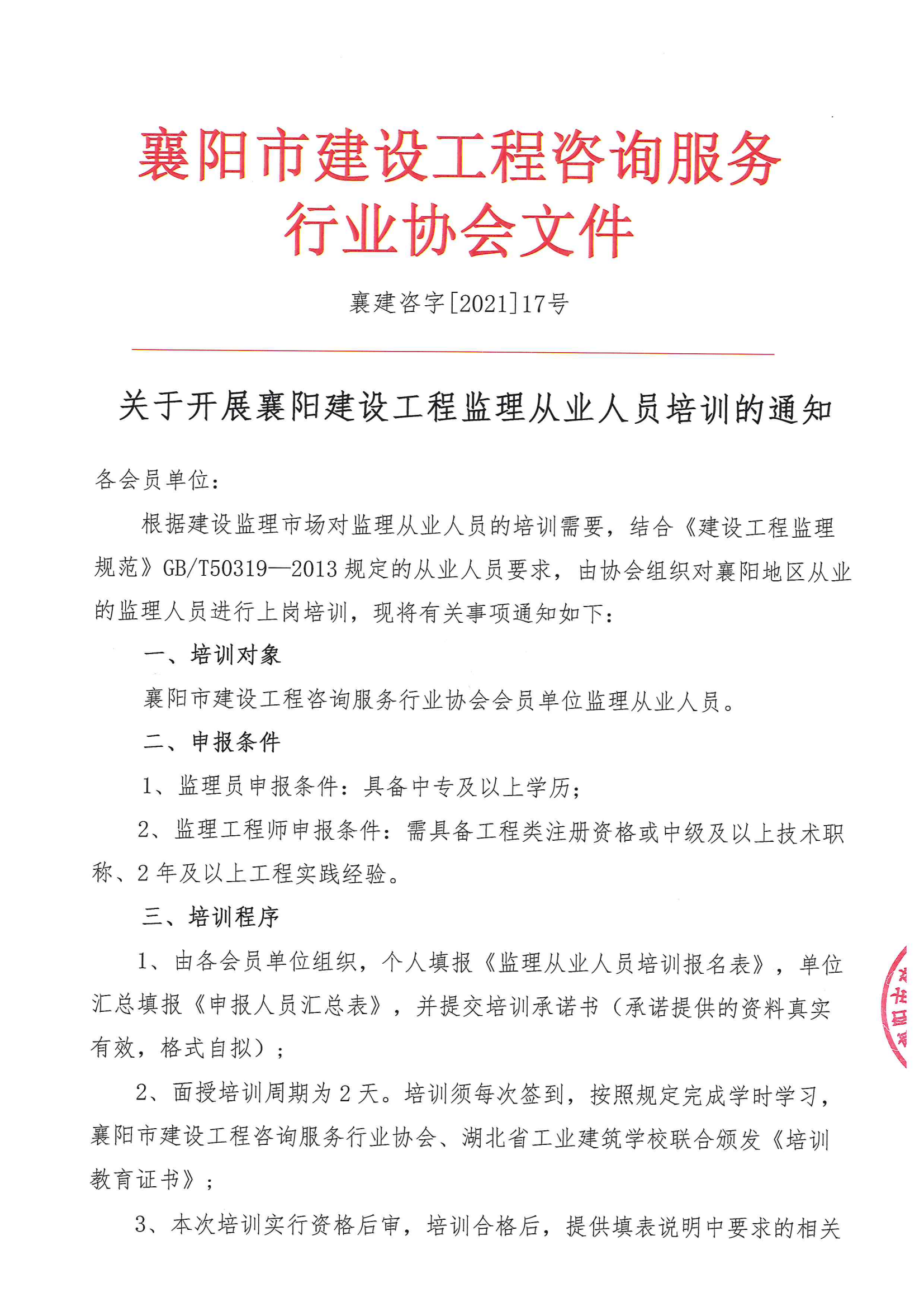 襄建咨字【2021】17号关于开展襄阳建设工程监理从业人员培训的通知