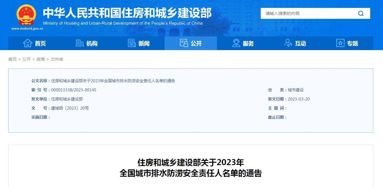 住房和城乡建设部公布2023年全国城市排水防涝安全责任人名单、排水防涝标准及对应降雨量
