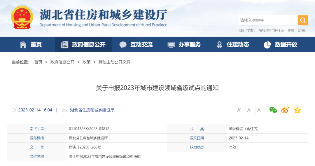省住建厅印发《关于申报2023年城市建设领域省级试点的通知》