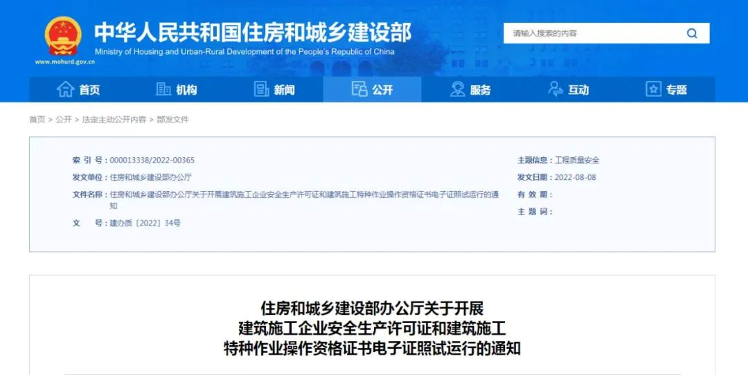 为进一步贯彻落实国务院关于加快推进电子证照扩大应用领域和全国互通互认的要求,深化“放管服”改革,提升建筑施工安全监管数字化水平,住房和城乡建设部印发《关于开展建筑施工企业安全生产许可证和建筑施工特种作业操作资格证书电子证照试运行的通知》。
