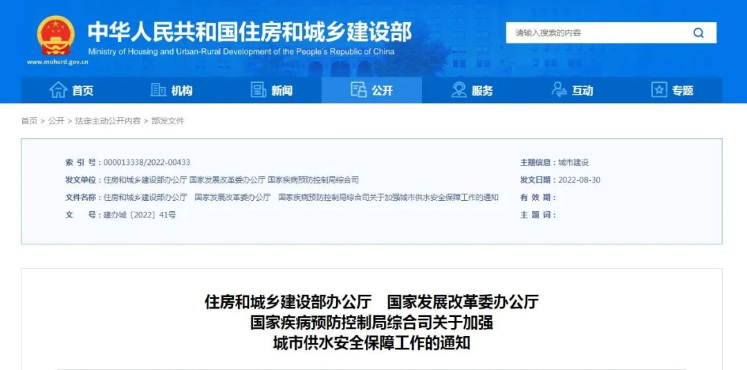 城市供水是重要的民生工程,事关人民群众身体健康和社会稳定。近日,为进一步提升城市供水安全保障水平,住房和城乡建设部办公厅、国家发展改革委办公厅、国家疾病预防控制局综合司联合印发《关于加强城市供水安全保障工作的通知》。通知提出,自2023年4月1日起,城市供水全面执行《生活饮用水卫生标准》;到2025年,建立较为完善的城市供水全流程保障体系和基本健全的城市供水应急体系。