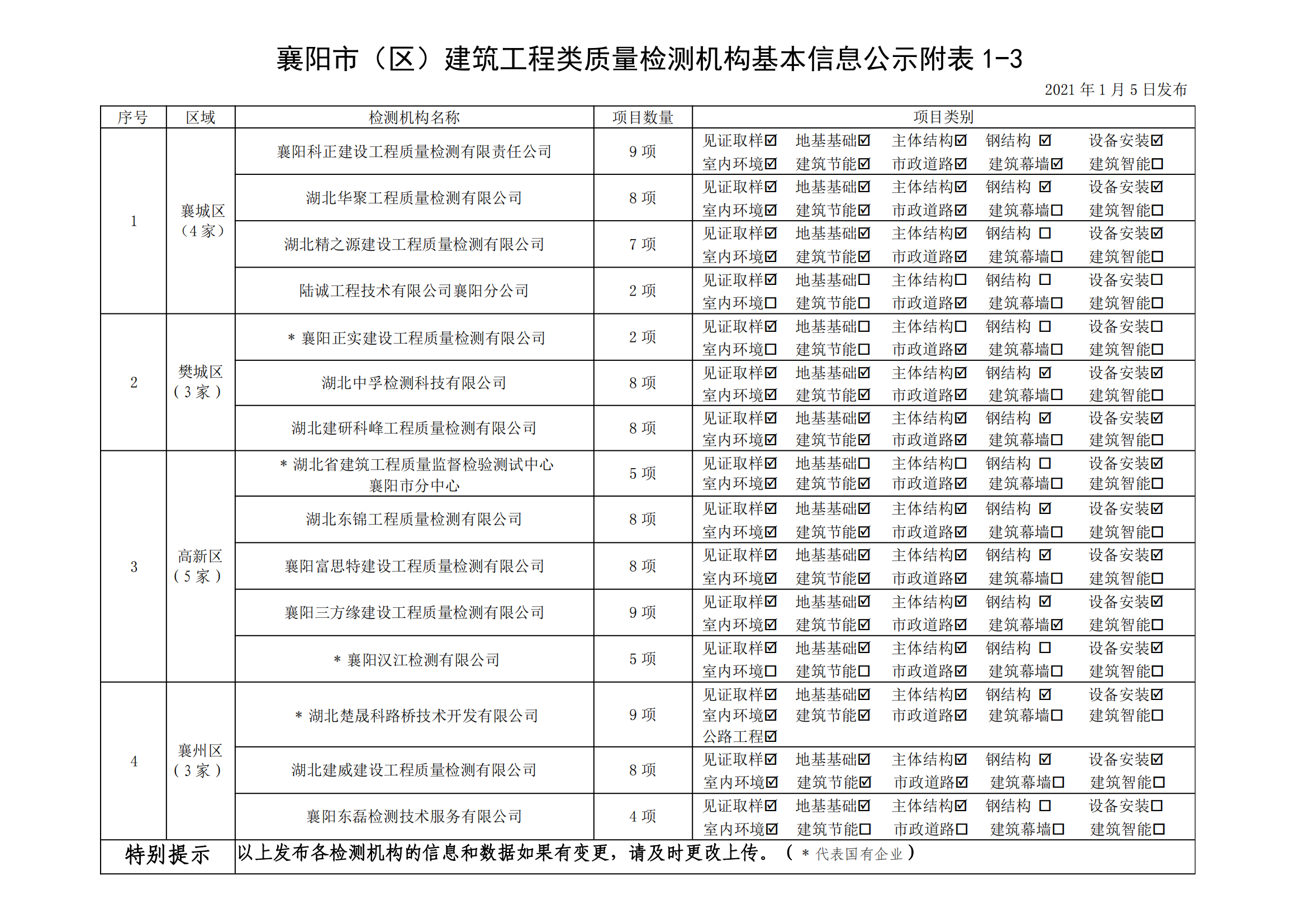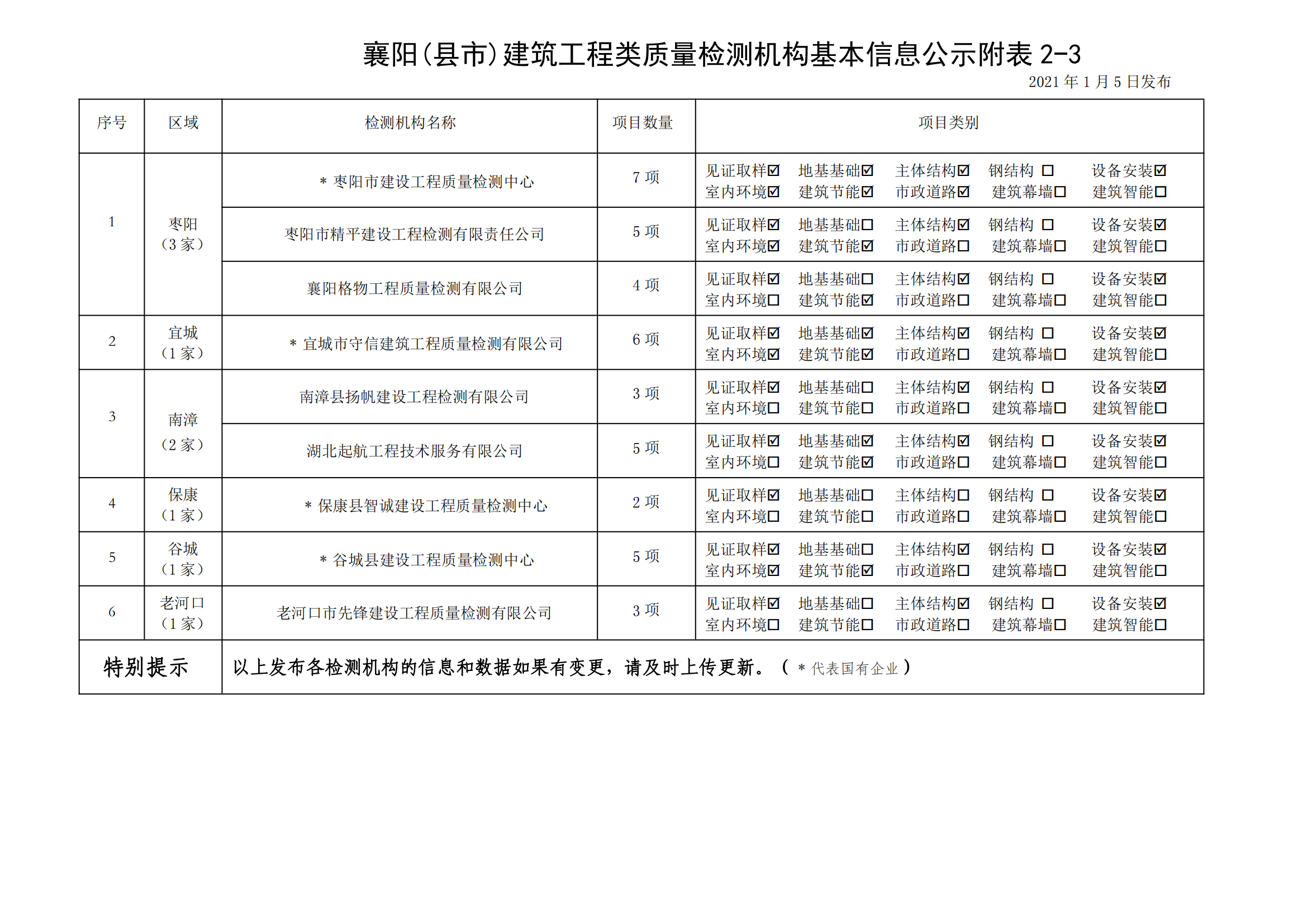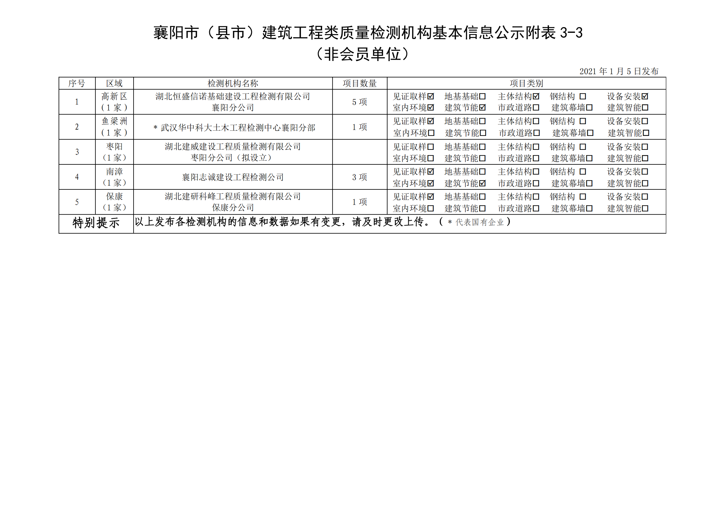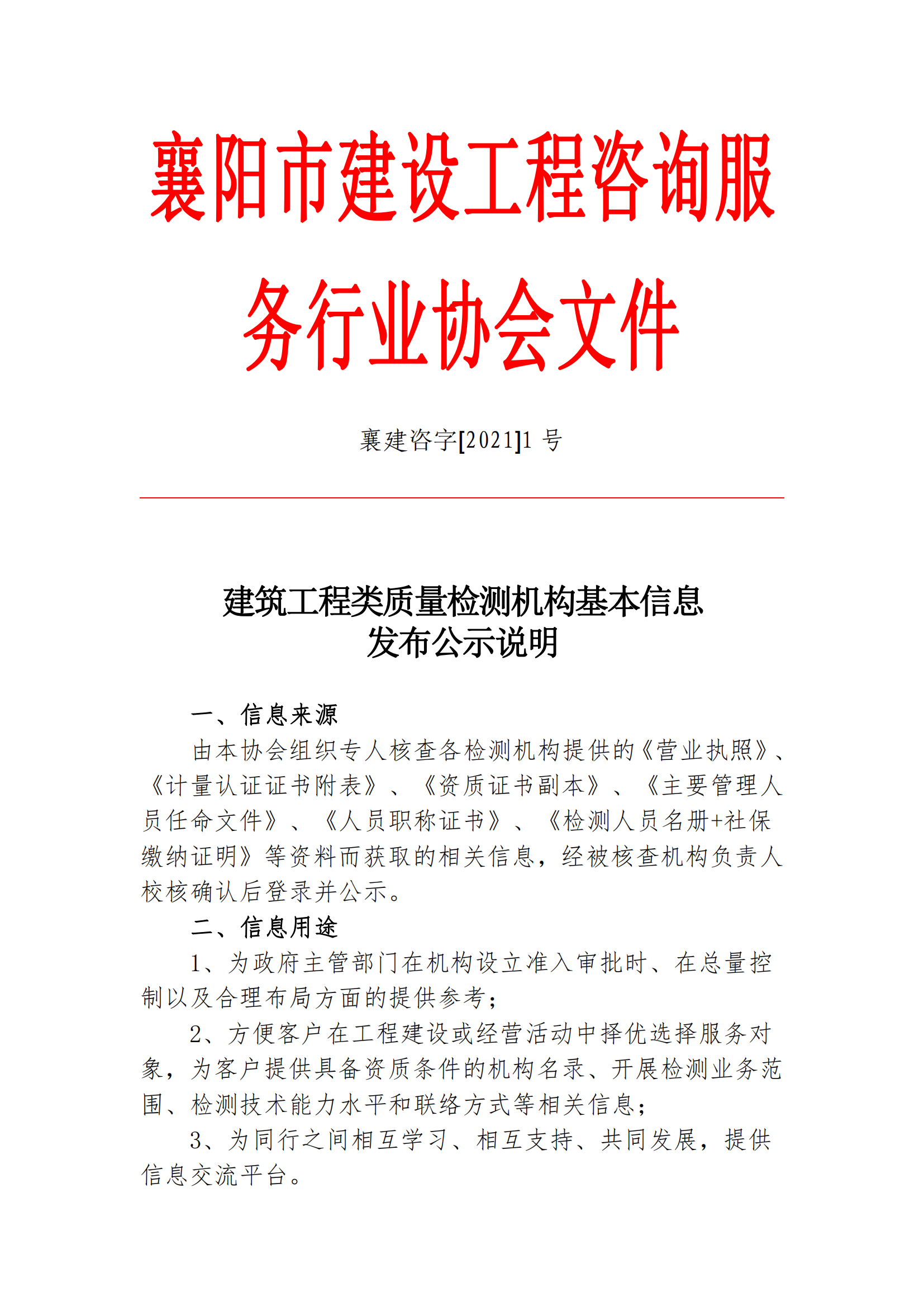 襄建咨字【2021】01号建筑工程类质量检测机构基本信息公示说明及附表