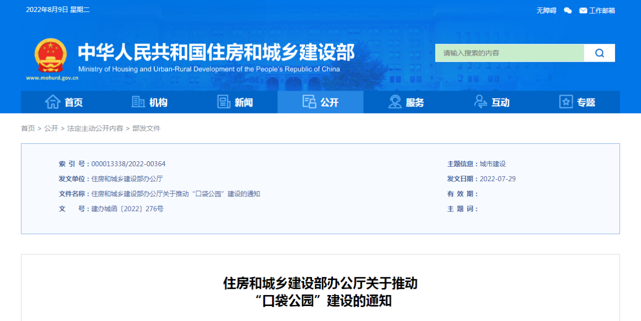 “口袋公园”是面向公众开放,规模较小,形状多样,具有一定游憩功能的公园绿化活动场地,面积一般在400至10000平方米之间,类型包括小游园、小微绿地等。因其小巧多样、环境友好、方便群众使用等特点,受到群众的普遍欢迎。各省级住房和城乡建设(园林绿化)主管部门要坚持以人民为中心的发展思想,充分认识“口袋公园”建设对于拓展绿色公共空间、方便群众就近游园的重要作用,将其作为持续为群众办实事的重要内容,组织本地区各城市建设一批群众满意的“口袋公园”,为群众提供更多方便可达、管理规范的公园绿化活动场地。