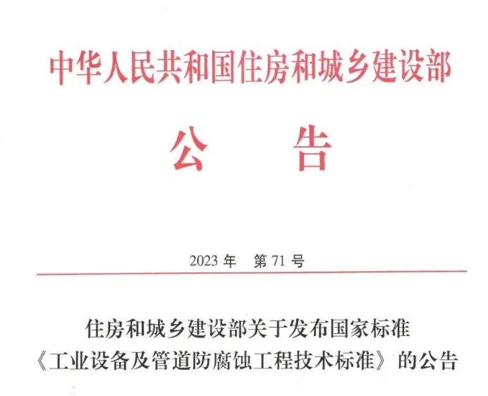 国家标准《工业设备及管道防腐蚀工程技术标准》GB/T50726-2023批准发布