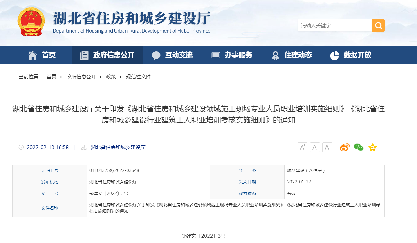 2.湖北省住房和城乡建设行业建筑工人职业培训考核实施细则